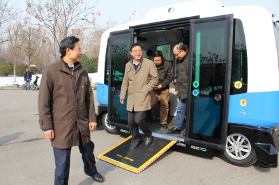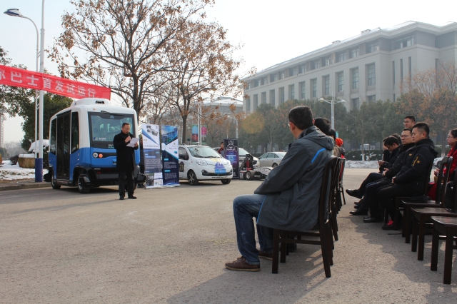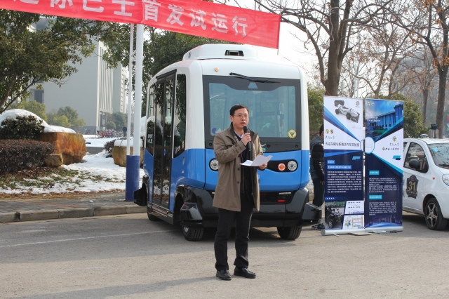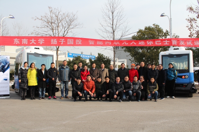 On the morning of February 2nd, 2018, Southeast University and Nanjing Yangzi State-owned Investment Group Co., Ltd. jointly launched the first trial run of the cooperative operation’s first domestic smart network unmanned minibus at Southeast University Jiulonghu Campus. Professor Wu Gang, vice president of Southeast University, chairman of Yangtze International Investment Group Long Cai, Zhisheng Zhang, secretary of the party committee of the mechanical engineering institute, head of school related department and all members of the bus operations team participated in the first commissioning event. The conference was presided over by Prof. Guodong Yin, vice president of the mechanical engineering institute.
