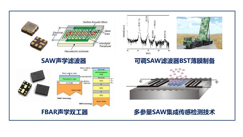 面向5G和6G移动通讯系统,研究超高频、低损耗声滤波器技术,建立器件的新结构体系,研发高性能声学材料,满足未来移动通讯对高频、大带宽、可调谐和低损耗器件的需求。实验室拥有相关实验设备包括:高真空磁控溅射台、射频网络分析仪、LRC测试平台、探针测试台。以此为研究平台目前承担国家十三五电子信息专项2项,科技委员会创新项目2项。