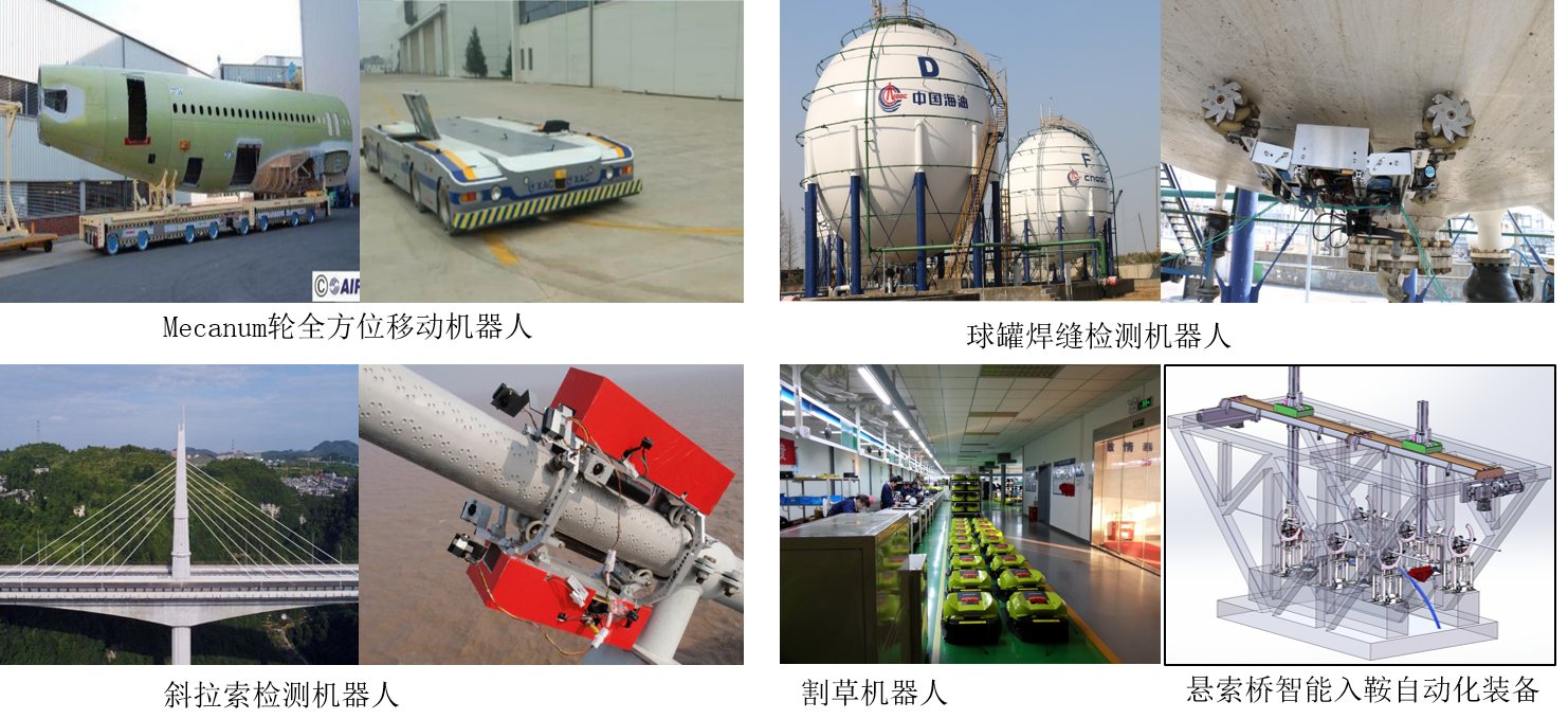 突出机器人应用工况的特殊性,通过创新型的结构设计、智能控制,实现复杂多变环境下特种机器人的应用研究,包括应用于大飞机制造的全方位移动机器人、应用于大型球罐焊缝检测、大桥斜拉索检测的移动机器人,以及(桥梁)建筑智慧建造过程的自动化装备等。