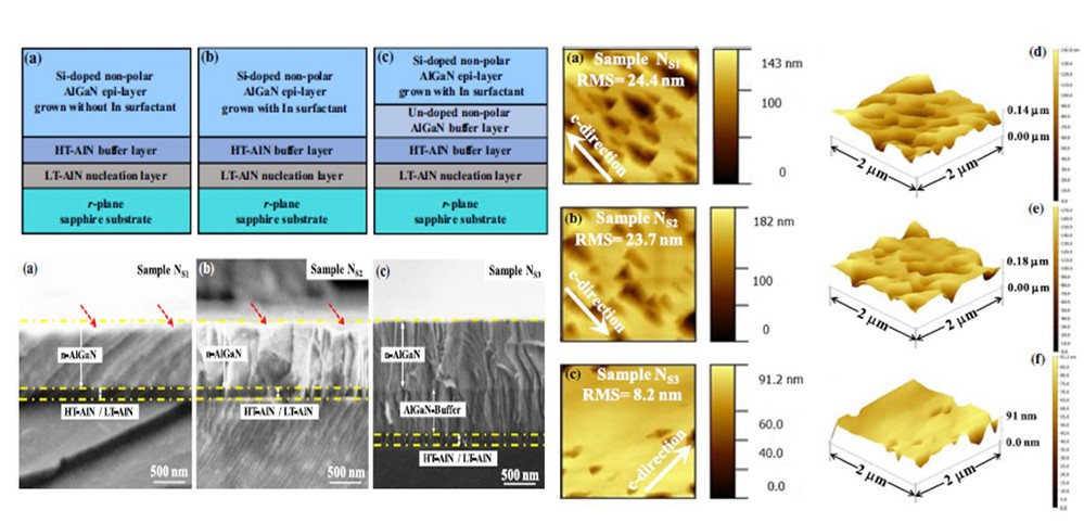 针对目前的极性AlGaN基UVC-LED外量子效率低(光电转换效率<3%),短波紫外(波长<280nm)应用受到限制这一世界性难题,研究采用多路脉冲MOCVD外延生长方法、Al组分渐变缓冲层、MgN和SiNx插入层、In表面活性剂、Si和Mg掺杂、具有纳米周期结构的非极性p型AlGaN/GaN DBR、多阶段异气体氛围快速热退火等一系列新技术、新工艺,首次制备出高晶体质量、发光波长在280 nm左右的非极性AlGaN基深紫外LED外延晶片。通过采用PL、HR-XRD、AFM、SEM、TEM等多种表征手段,测算出本研究制备的非极性UVC-LED的外量子效率达到7.96%。